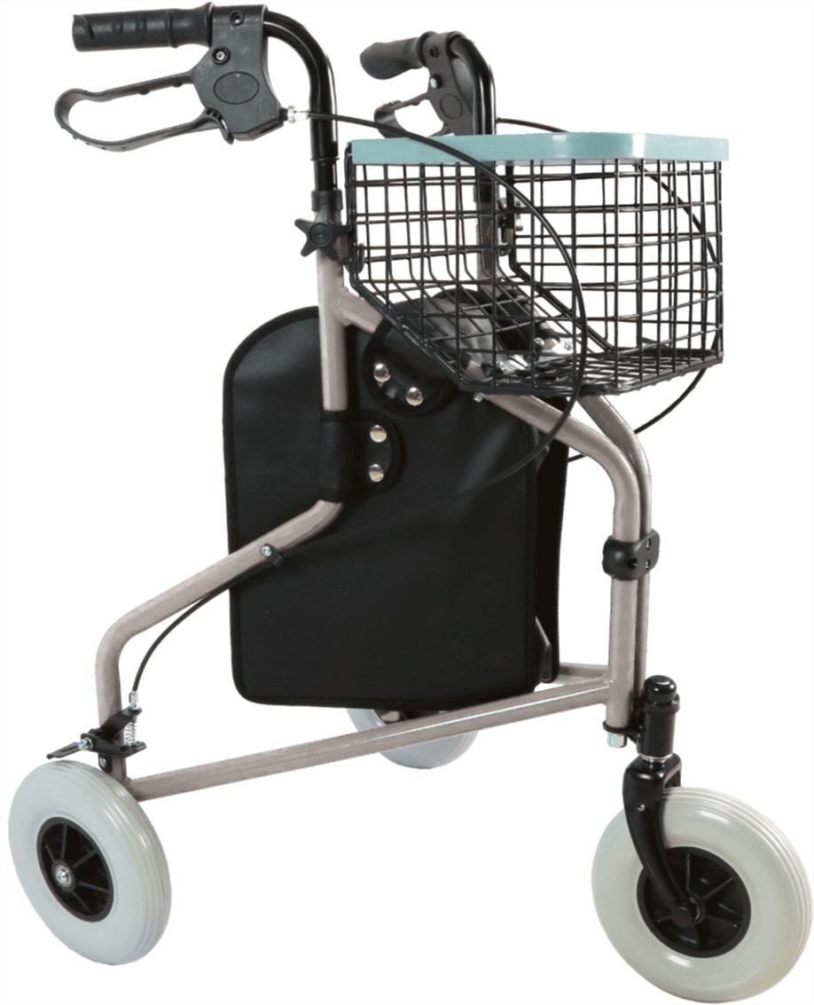 Stabilna konstrukcja stalowa zwiększa pewność podczas chodu i zmniejsza ryzyko potknięcia. Trzy koła z hamulcami wspierają kontrolę prędkości i ułatwiają zatrzymanie w miejscu. Składana rama oszczędza miejsce w mieszkaniu i bagażniku. Torba i koszyk pomagają przewozić drobne przedmioty bez obciążania rąk.